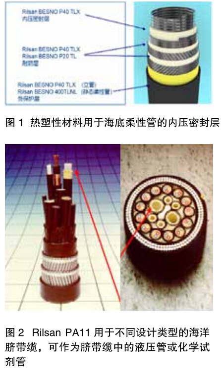 RilsanPA11 作為海洋油氣開發(fā)柔性管中的內壓密封層已有超過 40 年的應用歷史,見圖 1 所示。近年來為了保護鋼管在運輸具有腐蝕性油氣過程中不被腐蝕,Rilsan PA11 也被用作碳鋼管的內襯管使用,操作過程只需嵌入鋼管內即可(嵌入技術最初是為 PE 內襯管研發(fā))。與傳統(tǒng) PE 內襯管相比,Rilsan PA11 的使用范圍更寬,可以用于 45℃以上的酸性油氣環(huán)境,而在此之前只有抗腐蝕劑才可用于該種環(huán)境。目前,Rilsan PA11 作為內襯管已有多個成功安裝的案例。