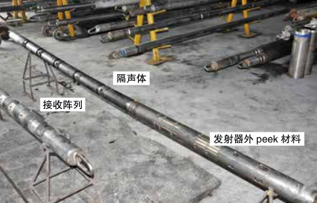 WSTT 儀器偶極發(fā)射器外殼開窗后有連接部分,見圖 1。該部分為儀器的主隔聲體,它還有一部分隔聲體放置在接收器的接收陣列之間,能夠最大限度的起到隔聲效果。該隔聲體能夠承受 100,000 磅的拉力或推力,還能在較寬頻率范圍內(nèi)隔離 90 分貝以上的聲波,其頻率可低到 500Hz~600Hz。但該節(jié)儀器的材質(zhì)軟,過度的彎曲會損壞內(nèi)部的密封而導(dǎo)致漏油。XMAC-II 的發(fā)射探頭及聲波隔聲體短節(jié)上有許多槽用來減少聲波在儀器體上的衰減,見圖 2。它的機械強度比外殼是實桿的儀器要低,因此避免對儀器施加過大的壓力。由于其機械強度不夠,XMAC-II 的聲波探頭及隔聲體短節(jié)在井下容易受壞損,進行測井過程中要格外注意,高速下放遇阻就可能導(dǎo)致?lián)p壞,打撈時成為了弱點。但就儀器發(fā)射效果而言,XMAC-II偶極發(fā)射器外殼開窗面積較大,發(fā)射時無遮攔物,發(fā)射效果較好。