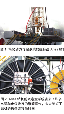 Aries 鉆機最具創(chuàng)新特征的一 點就是卷盤系統(tǒng)。該系統(tǒng)由集成驅(qū) 動公司(IDS)與 Orion 鉆井公司 聯(lián)合開發(fā),專門用于批量鉆井。卷 盤系統(tǒng)消除了批量鉆井的用電限制, 用一根 4,160 伏的單電纜為鉆機分 配電力,替代了從控制室到鉆臺的 30~40 根連接電纜。一直以來,電 力是通過電纜懸吊系統(tǒng)來輸送的。 集成驅(qū)動公司的 Myers 先生說: “這 可能需要 30 多根電纜和 90 多個連 接點,這么多的連接點很容易出現(xiàn) 接觸不良、斷路或觸點損壞故障”。 相比之下,卷盤系統(tǒng)僅通過一根電 纜和三個連接點就能實現(xiàn)電力輸送, 消除了大量的連接點故障,除了節(jié) 省大量施工時間外,還采用多電纜 插頭將多根電纜連接到接線點,而 插頭與插座的連接是最大的故障點。