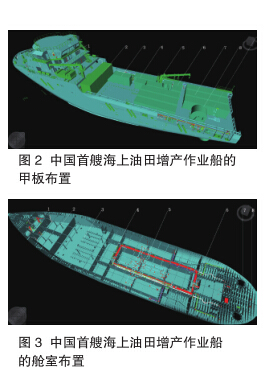 中國首艘海上油田增產(chǎn)作業(yè)船如 圖 1 所示,總長 81.15m,垂線間長 70.80m,型寬 18.00m,型深 7.40m, 最大吃水 5.8m。船上配有燃油艙 560m 3 ,壓裂泵柴油艙 36.9m 3 ,淡 水艙 360m 3 ,膠液艙 710m 3 ,可存 儲(chǔ) PH 值為 1~13 范圍內(nèi)的酸堿液體。 增產(chǎn)作業(yè)船的甲板區(qū)面積 645m 2 , 甲板均布負(fù)荷 5t/m 2 ;甲板上有兩 臺(tái)吊車,可全部覆蓋上甲板區(qū)域; 甲板上還有 15m 2 恒溫增產(chǎn)配件材料 房。該船總功率 6,000KW,總噸位 3,300t,最大載重量 2,810t,設(shè)計(jì) 航速 14.0 節(jié),可續(xù)航 6,000 海里。 該船主要進(jìn)行海上壓裂酸化作 業(yè),其甲板布置如圖 2 所示。圖 2 中 1 為 船 控 室 及 數(shù) 采 房, 配 備 有 ES-22ACD 型 號(hào) 的 數(shù) 采 房 1 套。