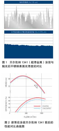 圖 1 中顯示了這些具疏水性特 種環(huán)氧涂層的光滑程度:敷涂了貝 爾佐納(Belzona)1341 的表面光 滑度是拋光后不銹鋼表面的 15 倍。 該涂層不僅可以提供腐蝕侵蝕保護, 而且也是為水泵、管道、閥門以及 其他流體處理設(shè)備提效而設(shè)計的高 性能涂層。 由于表面光滑以及阻力與摩擦 的減少,泵的水力性能得到顯著提 高。英國國家工程實驗室進行了測 試,圖 2 的性能曲線將涂裝貝爾佐 納 1341 前后的吸入與排出口徑為 250 毫米的單級端吸離心泵進行了 對比,結(jié)果顯示,未敷涂前,泵運 行 速 度 為 1,300 轉(zhuǎn) 數(shù) / 分, 泵 的 流量為 875 立方米 / 小時,揚程為 26.5 米,整體最高效率為 83.5%(水 泵效率是水泵有效功率與軸功率之 比)。 對 同 一 個 泵 涂 裝 貝 爾 佐 納 (Belzona)1341(超滑金屬)后 進行測試,結(jié)果顯示最高效率提高 了 6%,而在耗電負荷點上則減少了 5.1 千瓦時。根據(jù)上述結(jié)果,假設(shè)每 年 5,000 小時的運行周期,則可節(jié) 省電量高達 25,500 千瓦時。遍布全球的許多泵生產(chǎn)商也都測試出相 似的結(jié)果,根據(jù)該經(jīng)涂層保護的工 業(yè)設(shè)備所得到的反饋,表明了使用 該涂層的成本回報率超過購買新泵。