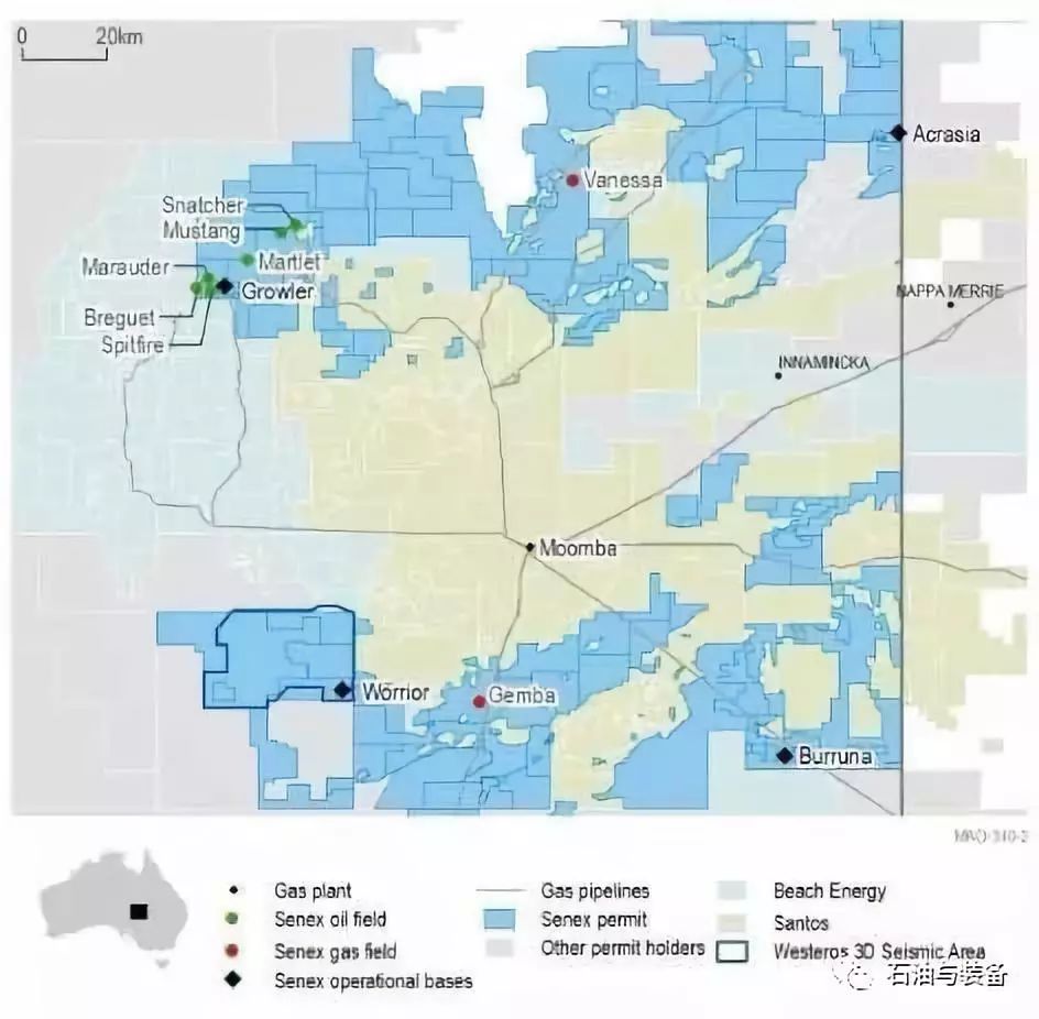 Gemba油田(PEL516: Senex 100%和運(yùn)營商)位于AllungaTrough西南邊緣,距離現(xiàn)有基礎(chǔ)設(shè)施約5公里,Moomba加工設(shè)施西南37公里。該氣田是在2018年底發(fā)現(xiàn)的,隨后的測(cè)試支持了大約15petaj的最終天然氣采收率估計(jì),取決于油田開發(fā)的成功(參考ASX2019年8月29日的公告)。