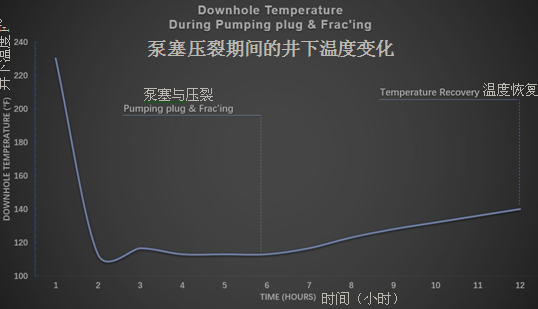 在泵入壓裂塞撐開裂縫時,大量的擁有表面溫度的流體被注入井筒,圖1顯示當壓裂塞進入井眼時,井下溫度會顯著降低,一旦壓裂塞到達預定位置,射孔槍射孔,之后被起出井眼,然后,接好設(shè)備準備壓裂。在這期間,井下溫度開始恢復。如果壓裂延遲,最好向井下泵入附加的表面溫度液冷卻井筒,以降低壓裂塞的溶解速度。當壓裂開始時,井下溫度會再次降低,一旦完成壓裂,井下溫度會慢慢恢復。