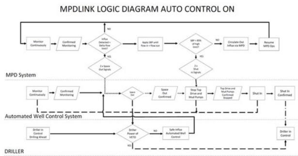 一旦MPD系統(tǒng)達到井控操作限值,MPD系統(tǒng)就會向自動井控系統(tǒng)發(fā)出信號,下令自動井控系統(tǒng)關井。然后,MPD操作人員會按照手動順序停止MPD作業(yè)進程。