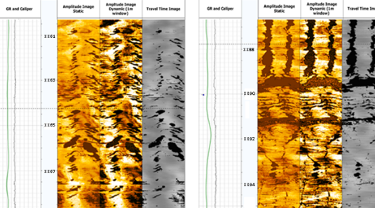 。見圖3(兩個(gè)井段的振幅和行程時(shí)間的測(cè)井成像,顯示了自然裂縫和鉆井誘發(fā)的裂縫,以及存在的爆裂情況)。成像儀可在油基或水基泥漿體系的鉆井環(huán)境下提供高分辨率井眼圖像和井徑測(cè)量數(shù)據(jù)。記錄從井壁反射的超聲波的振幅和行程時(shí)間。這些測(cè)量數(shù)據(jù)被記錄在井眼圓周周圍的128個(gè)方位扇區(qū)中,鉆進(jìn)時(shí)即可提供360°環(huán)繞井眼圓周的高分辨率測(cè)井圖像。