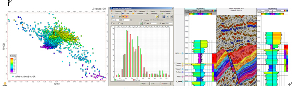多窗口聯(lián)動顯示是數(shù)據(jù)質(zhì)控的另一有效的方法。例如測井曲線在3D窗口的顯示與連井窗口的顯示,可以快速定位曲線的異常值。地震數(shù)據(jù)2D與3D窗口的聯(lián)動,地質(zhì)模型在2D、3D、剖面和Map窗口的聯(lián)動對于分析地質(zhì)甜點區(qū)域,鉆井軌跡設計起著非常重要的作用。此外,Histogram窗口,F(xiàn)unction 窗口,Stereonet窗口等對數(shù)據(jù)的檢查分析,質(zhì)控過濾等也起著非常重要的作用,而且在這些窗口中的過濾,可以直接應用窗口間的聯(lián)動來在2D或者3D窗口中來進行查看。而且許多必要的結(jié)果都可以直接在窗口中生成相應的Report,真正對關鍵步驟做到數(shù)據(jù)監(jiān)控,從而實現(xiàn)對研究成果的可靠控制,見圖3。