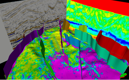 油藏建模人員可以直接應用Petrel中的地震解釋的時間層位或者深度層位來進行油藏地質(zhì)建模,可以直接應用速度模型進行時深轉(zhuǎn)換,并可以直接應用地震數(shù)據(jù)對油藏地質(zhì)建模的斷層模型及地質(zhì)模型進行質(zhì)量控制。Petrel勘探開發(fā)一體化平臺為勘探人員與開發(fā)人員間建立了良好的橋梁。
