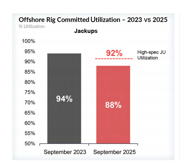 圖4 據(jù)韋斯特伍德全球能源集團(tuán)數(shù)據(jù)顯示,截至2025年9月,自升式鉆井平臺(tái)的合同利用率(涵蓋已簽訂作業(yè)合同及已確定未來(lái)作業(yè)意向的平臺(tái))為88%,較兩年前的94%有所下滑。不過(guò),高規(guī)格自升式鉆井平臺(tái)的市場(chǎng)表現(xiàn)則好得多,其利用率仍穩(wěn)定在92%左右。