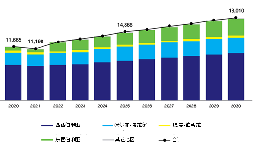 在預(yù)測(cè)的 MWD 和 LWD 操作以及動(dòng)力馬達(dá)和旋轉(zhuǎn)導(dǎo)向服務(wù)的樂(lè)觀情景中,是基于預(yù)測(cè)石油產(chǎn)量的樂(lè)觀情景。它假設(shè)未來(lái)幾年石油需求的復(fù)蘇將更快,因此俄羅斯將不那么嚴(yán)格地遵守任何生產(chǎn)限制。該情景預(yù)測(cè),到 2030 年,MWD 運(yùn)營(yíng)將比 2020 年增長(zhǎng) 61.9%,總計(jì) 18885 個(gè)工作崗位。 從2021年到2030年,這些業(yè)務(wù)數(shù)量的年均增長(zhǎng)率將達(dá)到4.9%。2021-2030 年 MWD 作業(yè)數(shù)量的增長(zhǎng)是基于已投入使用的水平井?dāng)?shù)量的增長(zhǎng),以及側(cè)鉆作業(yè)數(shù)量的增加以及斜井?dāng)?shù)量的減少。 在區(qū)域上,西西伯利亞仍將是 MWD 操作占主導(dǎo)地位的主要區(qū)域,就像在中立情景中一樣,而東西伯利亞將位居第二。MWD 作業(yè)數(shù)量的增加是基于東西伯利亞增加了 44% 和西西伯利亞增加了 39%。就像在中性情景中一樣,在大部分地區(qū),MWD 作業(yè)數(shù)量的變化是由水平井的增加和側(cè)鉆作業(yè)的增加引起的。2030年MWD作業(yè)總量中,西西伯利亞和東西伯利亞占76%,分別占55%和21%。
