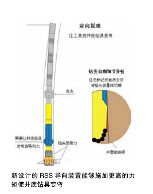 頁巖鉆井的興起將旋轉(zhuǎn)導(dǎo)向系統(tǒng)帶入一個(gè)更高水平的開發(fā)階段,在保持現(xiàn)有租賃價(jià)格的前提下,還要鉆出最長的斜深,作為回應(yīng)這種需求,一種新的造斜率在 15° / 30m 的旋轉(zhuǎn)導(dǎo)向系統(tǒng)RSS 被研發(fā)成功。在一些井的鉆井作業(yè)中,新開發(fā)的 RSS 系統(tǒng)可一次下井鉆完垂直段、造斜段和水平段。新旋轉(zhuǎn)導(dǎo)向系統(tǒng)(RSS)對(duì)筒體進(jìn)行了改進(jìn),使其井壁接觸面更長,其更短的三點(diǎn)幾何形體設(shè)計(jì),能打出更短半徑或更高曲率的造斜井段。