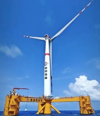 對于遠(yuǎn)海,可采用“就地取材”利用風(fēng)電方式。我國中海油在海洋工程作業(yè)方面,實(shí)力雄厚、經(jīng)驗(yàn)豐富,具有建設(shè)海上風(fēng)電的得天獨(dú)厚優(yōu)勢, 應(yīng)該大力發(fā)展海上風(fēng)電,將風(fēng)電場聯(lián)網(wǎng),為遠(yuǎn)海油氣田群供電。風(fēng)能零碳排放,純屬綠色能源。因此,這種方式既可提供綠電,又可通過電網(wǎng)各油氣田間相亙調(diào)劑供電,還可利用風(fēng)電制氫, 助力新能源氫能的發(fā)展。顯然, 這種方式一舉多得,勢在必行。盡管遠(yuǎn)海深水建設(shè)風(fēng)電困難很大, 但是, 最近中海油已取得了突破性進(jìn)展。入選國內(nèi)2023年十大科技新聞的我國自主設(shè)計(jì)建造的裝機(jī)容量7.25兆瓦的全球首座浮式遠(yuǎn)海深水風(fēng)電平臺“海洋觀瀾”號(見圖2),已于2023年5月在福建海域成功投產(chǎn)并網(wǎng)發(fā)電。這一進(jìn)展, 它標(biāo)志著我國遠(yuǎn)海深水風(fēng)電建設(shè)已邁出關(guān)鍵性一步, 它為我國遠(yuǎn)海深水油氣田的綠電供給,打下了良好基礎(chǔ)。