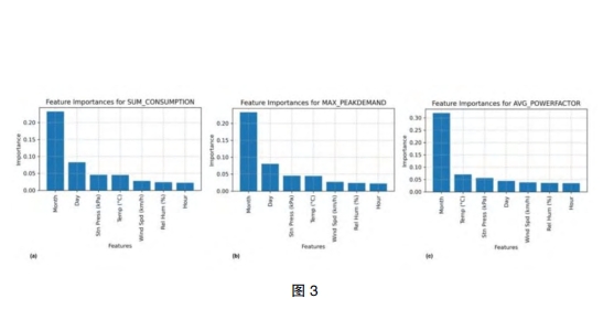敏感性分析幫助我們了解天 氣變量的變化如何影響電力消耗、 峰值需求和功率因數(shù)。通過(guò)特征 重要性分析、偏相關(guān)圖和相關(guān)分 析,確定影響最大的天氣參數(shù)。 這種理解對(duì)于完善模型并將其有 效地應(yīng)用于石油和天然氣行業(yè)至關(guān)重要。以下各節(jié)詳細(xì)介紹每種 敏感性分析方法。 圖 3 中的特征重要性圖概述 了各種輸入特征如何有助于預(yù)測(cè) 電力消耗、峰值需求和功率因數(shù)。 從圖 3a 中,我們可以看到月是預(yù) 測(cè)電力消耗最具影響力的特征, 其 次 是 日。 其 他 特 征, 如 溫 度 (° C)、站壓 (kPa)、風(fēng)速 (km/h)、 相對(duì)濕度 (%) 和小時(shí)的重要性逐 漸降低。 同樣,圖 3b 強(qiáng)調(diào)了月份對(duì) 于預(yù)測(cè)最大峰值需求至關(guān)重要, 其他與天氣相關(guān)的特征影響相對(duì) 較小。在圖 3c 中,我們看到月份 對(duì)于預(yù)測(cè) AVG 功率因子的重要 性也占主導(dǎo)地位,溫度 (° C) 是 最重要的天氣相關(guān)特征,盡管影 響仍然小于時(shí)間變量。