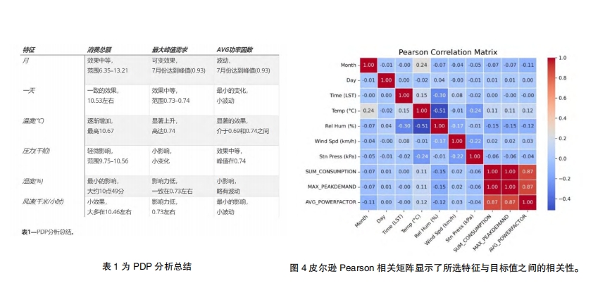 部分圖 (pdp) 提供了對(duì)每 個(gè) 特征如何影響電力消耗、峰值需 求和功率因數(shù)目標(biāo)值的全面理解。 從表 1 中可以看出,月的特征表 現(xiàn)出中等到顯著的影響,電力消 耗的部分依賴值在 6.35 和 13.21 之間波動(dòng),反映了能源使用的季 節(jié)性趨勢(shì)。這種可變性對(duì)于最大 峰值需求和平均功率因數(shù)也很明 顯,其中月在 7 月達(dá)到峰值,表 明其與捕獲能源指標(biāo)的月度變化 相關(guān)。 特征日對(duì)所有目標(biāo)值的影響 一致而適度,表明每日波動(dòng)雖然 不太明顯,但仍與準(zhǔn)確的能源預(yù) 測(cè)有關(guān)。溫度是一個(gè)關(guān)鍵的天氣 變量,其部分依賴值逐漸增加, 電力消耗的峰值為 10.67,最大 峰值需求和 AVG 功率因數(shù)的峰 值均為 0.74。這種對(duì)所有目標(biāo)值 的一致影響強(qiáng)調(diào)了溫度在影響能 耗、峰值需求和功率因數(shù)方面的 關(guān)鍵作用。