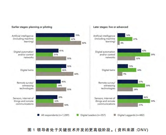 這項調(diào)查揭示了所謂的“數(shù)字領(lǐng)導(dǎo)者”和“數(shù)字落后者”之間的鮮明對比。雖然28%的受訪者表示他們的組織在數(shù)字化方面表現(xiàn)出色,并對實現(xiàn)收入、利潤和脫碳目標(biāo)表現(xiàn)出更大的樂觀情緒,但37%的受訪者表示相反。領(lǐng)導(dǎo)者在使用數(shù)字技術(shù)進行脫碳和能源轉(zhuǎn)型方面遙遙領(lǐng)先,68%的領(lǐng)導(dǎo)者擁有高質(zhì)量的數(shù)據(jù),80%的領(lǐng)導(dǎo)者已經(jīng)從數(shù)字技術(shù)中受益,而落后者的比例分別為21%和33%。在新興技術(shù)方面,如人工智能(27%)和數(shù)字孿生(34%),大約三分之一的領(lǐng)導(dǎo)者說他們是活的或先進的,相比之下,落后者的比例只有個位數(shù)。事實上,大多數(shù)落后者報告說,在DNV詢問的所有關(guān)鍵技術(shù)中,他們都處于早期開發(fā)階段(規(guī)劃或試驗階段)(圖1)。
