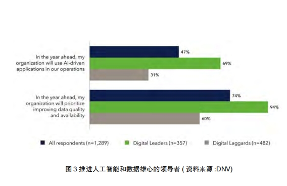 在參與DNV調(diào)查的1,300名高級專業(yè)人士中,近50%的人表示,他們計劃在未來一年將人工智能驅(qū)動的應(yīng)用集成到他們的運營中,由數(shù)字領(lǐng)導(dǎo)者帶頭。數(shù)字領(lǐng)導(dǎo)者最有效的三大數(shù)據(jù)驅(qū)動應(yīng)用是優(yōu)化流程、集成系統(tǒng)和數(shù)據(jù)庫以及自動化運營(圖2)。然而,50~60%的領(lǐng)導(dǎo)者也報告了從預(yù)測性維護到供應(yīng)鏈管理的一系列其他數(shù)據(jù)驅(qū)動創(chuàng)新的重大或巨大影響。落后者全面落后,在關(guān)鍵領(lǐng)域的差距最大,如系統(tǒng)和數(shù)據(jù)庫的集成、自動化運營以及賦予消費者或客戶權(quán)力。應(yīng)用程序的價值經(jīng)常被涉及系統(tǒng)和數(shù)據(jù)庫集成的問題沖淡。AkerBP的首席數(shù)字官PaulaDoyle說:“通常,公司有許多遺留系統(tǒng),數(shù)據(jù)被鎖定在應(yīng)用程序中。”她繼續(xù)解釋說:“有必要將數(shù)據(jù)從工業(yè)系統(tǒng)中解放出來,并將其融入環(huán)境中,使人類和機器都可以訪問這些數(shù)據(jù),從而做出更好、更快的決策。”人工智能和高級數(shù)據(jù)分析在這一轉(zhuǎn)變中至關(guān)重要。該報告估計,到2050年,人工智能將支持清潔能源發(fā)電成本減少1.3萬億美元,電網(wǎng)設(shè)備成本減少1,880億美元。總體而言,電力系統(tǒng)成本將降低6~13%。人工智能現(xiàn)在是能源系統(tǒng)不可或缺的組成部分,47%的受訪者表示,他們的組織將在未來一年的運營中使用人工智能驅(qū)動的應(yīng)用程序-對于數(shù)字領(lǐng)導(dǎo)者,這一數(shù)字高達69%(圖3)。Doyle強調(diào)了變得更加數(shù)據(jù)驅(qū)動的挑戰(zhàn),強調(diào)需要專業(yè)的員工隊伍來有效地跟蹤和管理數(shù)據(jù)。“數(shù)據(jù)交付的高效自動化變得極其重要。”她說:“這就是人工智能可以發(fā)揮關(guān)鍵作用的地方。”