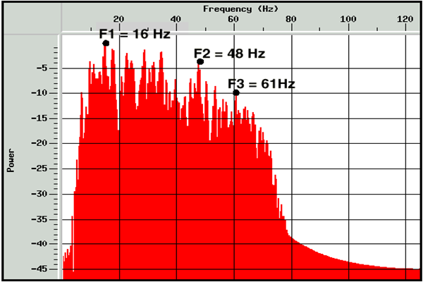 主頻系列F1、F2、F3 給定時(shí)窗 內(nèi)的每一個(gè)輸入道的估算值是由能量 譜中的三個(gè)最主要頻率分量組成,這 三個(gè)分量即為圖2 中的F1、F2、F3。 其中F1 是低頻段的峰值,F(xiàn)2 是中間 頻段的峰值,F(xiàn)3 是高頻段的峰值。圖 2 所繪的能量譜圖通過對(duì)所有地震道進(jìn) 行快速傅立葉變換后經(jīng)最大熵法得到。最大熵方法是在有限的時(shí)窗內(nèi)得到可靠估算值的一種方法,是對(duì)三個(gè)主頻的 數(shù)學(xué)方法估算值,并且這些估算值可能不總是與實(shí)際能量譜上看到的峰值一樣。這三組屬性有助于在數(shù)據(jù)時(shí)窗內(nèi)確 定主頻特征,在任意或所有主頻系列屬性里側(cè)向變化,可能包含由油氣飽和度或斷裂導(dǎo)致的頻率吸收效應(yīng)的特征,例如油氣飽和的砂體削弱了較高的頻率,這樣會(huì)得到較低的一個(gè)或所有的主頻。因此通過分析主頻系列F1、F2、F3 特性可以更好地對(duì)油氣飽和度或斷裂等特征進(jìn)行研究。