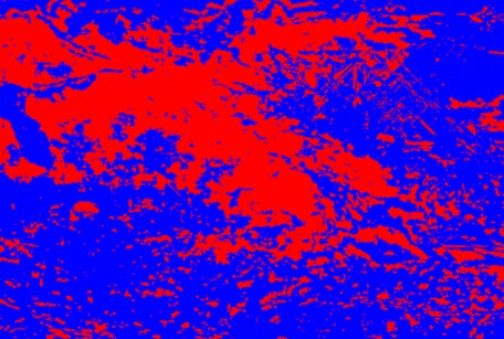 實(shí)驗(yàn)的主要目的是通過(guò)FLD 算法建立含油氣性模型并通過(guò)求取測(cè)井符合率對(duì)FLD 分類(lèi)能力進(jìn)行檢驗(yàn),同時(shí)驗(yàn)證FLD 可否用于儲(chǔ)層預(yù)測(cè)。利用判別規(guī)則將所有測(cè)井進(jìn)行分類(lèi)判別。假設(shè)所有測(cè)井的預(yù)測(cè)結(jié)果與真實(shí)含油氣性相吻合,分類(lèi)能力較好,則投影方向和閾值可用于整個(gè)區(qū)塊儲(chǔ)層預(yù)測(cè)中,同時(shí)也證明FLD 可用于建立含油氣性模型。對(duì)某區(qū)塊進(jìn)行儲(chǔ)層預(yù)測(cè)外推,區(qū)塊范圍為Inline(350~900),Xline(550~920),預(yù)測(cè)結(jié)果如圖所示,其中紅色代表預(yù)測(cè)結(jié)果為含油氣區(qū)域,藍(lán)色代表預(yù)測(cè)結(jié)果為不含油氣區(qū)域。