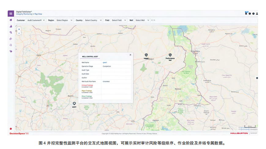 圖4 井控完整性監(jiān)測平臺的交互式地圖視圖,可展示實時審計風(fēng)險等級排序、作業(yè)階段及井場專屬數(shù)據(jù)。