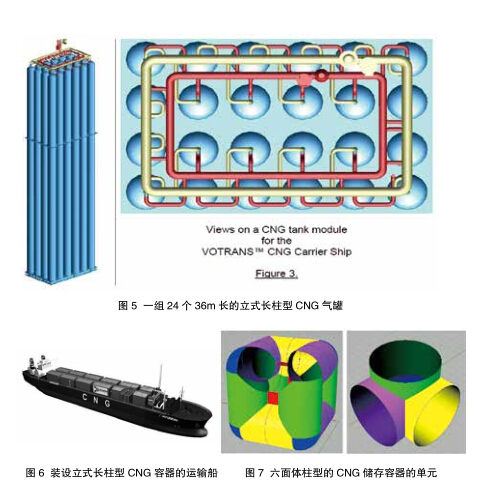 立式長柱型。立式長柱型是美國研發(fā)出的 VOTRANS 產(chǎn)品。該專用容器是在 -29℃低溫及 10~13MPa 壓力下儲(chǔ)藏 CNG ,它是由 24 個(gè) 36m 長的長柱型氣罐組成一組,100 組可以裝載 2×10 7 m 3 ,見圖 5 和圖 6 所示。采用立式長柱型的運(yùn)輸船裝卸過程是利用低溫液體置換原理來完成。卸載時(shí)將恒溫恒壓的低溫液體,泵入儲(chǔ)罐內(nèi),從而將氣體置換出來;裝載時(shí)則采用相反的過程,經(jīng)過加壓降溫的氣體將儲(chǔ)罐中的低溫液體換出,最終裝滿儲(chǔ)罐。單次航程可達(dá) 1,552km。裝設(shè)立式長柱型 CNG 容器的運(yùn)輸船優(yōu)點(diǎn)包括:低溫儲(chǔ)存容器壁厚減小,低溫儲(chǔ)存其儲(chǔ)存壓力只是常溫儲(chǔ)存的一半,減小了容器壁厚,降低了船體自重;低壓儲(chǔ)存氣體殘量減少,儲(chǔ)氣壓力低時(shí),天然氣卸載后的殘留氣量將大大減少(約為 1%),遠(yuǎn)低于高壓儲(chǔ)存(約為 10%),提高了船的體積利用率;便于改造縮短建造周期,用現(xiàn)有的單殼體油輪,即可將其改造為可運(yùn)輸 8.5~34×10 4 m 3 的CNG 運(yùn)輸船,從而縮短建造周期,降低成本。