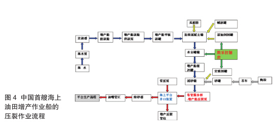 數(shù)采控制房內(nèi)可實(shí)現(xiàn)各膠液泵和各 海水泵的啟??刂坪途o急聯(lián)???制。數(shù)采房內(nèi) 7 英寸顯示屏可顯示 出各膠液艙和甲板各液罐液位,具 備高低液位報(bào)警及擴(kuò)展的功能,上 甲板液罐則另增設(shè)單獨(dú)的高低液位 報(bào)警系統(tǒng)。數(shù)采控制房內(nèi)設(shè)備集成 膠液系統(tǒng)(包括甲板液罐液位)、 火災(zāi)報(bào)警系統(tǒng)、電話系統(tǒng)等,增產(chǎn) 作業(yè)時(shí),無需停泵,數(shù)采控制房即 可提供液體體系和液體配方的實(shí)時(shí) 質(zhì)量監(jiān)控。 圖 2 中 2 為 砂 罐,3 為 混 輸 砂 裝置,砂罐最大容積 25m 3 ,共 4 套, 配有水平輸砂系統(tǒng)1套, 混砂橇1臺(tái), 最大排量 9.53m 3 /min。圖 2 中 4 為 連續(xù)混配裝置,5 為吊機(jī),海水與 各類藥劑混合后的混合液輸送到混 砂橇,與吊機(jī)吊送到混砂橇的增產(chǎn)海 上油田進(jìn)行增產(chǎn)作業(yè), 必須要求平臺(tái)具有大 面積甲板及空間和承 載能力,以滿足進(jìn)行 增產(chǎn)作業(yè)時(shí)設(shè)備的安放及頻繁的吊 裝需要。為解決這一矛盾,國外已 推出了一種海上油田增產(chǎn)作業(yè)船, 可不占用井口平臺(tái)甲板進(jìn)行增產(chǎn)作 業(yè)。