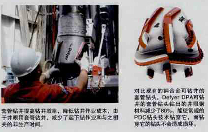 這種技術制造出的套管鉆頭鉆出的井眼與常規(guī)的同類套管鉆頭相比,鋼材料減少了80%,鉆頭增加了損壞保護功能;新的可鉆井的套管鉆頭技術已在全球各種不同地層和高強度壓縮地層中得到了推廣應用,并且獲得了一項平均鉆出時間小于20分鐘的記錄。
