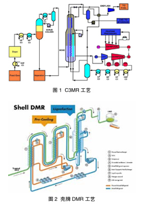 截至 2015 年底,全球 LNG 額 定液化能力中 80% 采用美國 APCI 公 司 C3MR 及 改 進(jìn) 工 藝, 其 中, C3MR 占 49%,C3MR/SplitMR 占 15%,AP-X 技術(shù)占 16%;康菲 優(yōu)化級聯(lián)式工藝占 14%;殼牌公司DMR 工 藝 占 3%;Linde/Statoil 公司 MFC 工藝占 1%,其他小項目 主要采用 SMR 工藝,占 2%。 C3MR 為丙烷預(yù)冷混合冷劑流 程,最大裝置規(guī)模約 4 百萬噸 / 年。 該工藝業(yè)績最多,建成生產(chǎn)線近百 條,相對能效 100%,其特點是高 能 效、 設(shè) 備 較 少, 適 用 于 大 型 裝 置,不適用于海上 FLNG 項目。