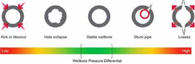 井內的每一次活動都會改變施加在裸眼井上的壓力,而每一種緩解技術都試圖將期望的壓力保持在可接受的范圍內。如果壓力過低,主要后果是井涌、井噴和井底坍塌,見圖1。壓力過高會破壞油藏,導致流體漏失,減緩作業(yè)速度。當這些不幸的事件發(fā)生時,補救行動通常是必要的,但增加了安全暴露、非生產時間和項目的整體成本。