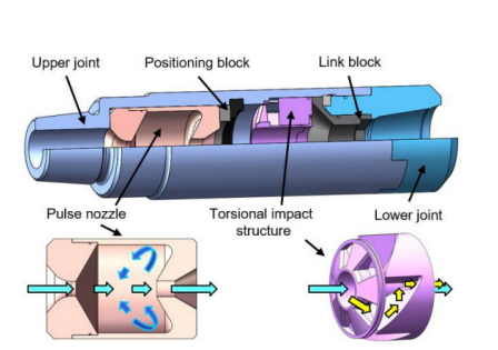 其工作流程清晰且高效:當鉆井液進入脈沖噴嘴結(jié)構(gòu)的腔體時,會觸發(fā)自激振蕩效應(yīng),產(chǎn)生主頻大于 200Hz 的高頻軸向沖擊載荷;隨后,振蕩射流進入扭沖腔,沖擊腔體內(nèi)徑向壁面,轉(zhuǎn)化為高頻扭轉(zhuǎn)沖擊載荷;最終,這兩種復合沖擊載荷通過下部接頭傳遞至鉆頭,同時實現(xiàn)軸向和扭轉(zhuǎn)方向的高頻沖擊,有效緩解粘滑現(xiàn)象,顯著提升鉆井速度。