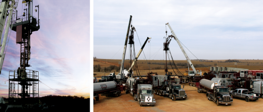 開(kāi)拓者能源服務(wù)公司活躍在美國(guó)大部分頁(yè)巖盆地,尤其是墨西哥灣沿岸地區(qū)。該公司擁有125部修井鉆機(jī),這些鉆機(jī)的天車(chē)向外探出,鉆臺(tái)也向外擴(kuò)展了許多,這些設(shè)備使鉆臺(tái)的作業(yè)空間增大,這讓游車(chē)的操作更安全。這些鉆機(jī)的井架較高,鉆臺(tái)與司鉆操作臺(tái)一并設(shè)計(jì),使得鉆臺(tái)能升至36ft的高度,以容納更高壓力環(huán)境的防噴器(blowout preventer, 簡(jiǎn)稱(chēng)BOP)堆疊。550-600馬力的鉆機(jī)包括BOP安全控制與隔離以及BOP輔助關(guān)井系統(tǒng)。圖2中的左圖:開(kāi)拓者能源服務(wù)公司的員工們正使用修井鉆機(jī)在一口鷹福特頁(yè)巖井進(jìn)行生產(chǎn)油管的下井作業(yè);右圖:該公司一部修井鉆機(jī)正在一口鷹福特頁(yè)巖井進(jìn)行施工作業(yè)。