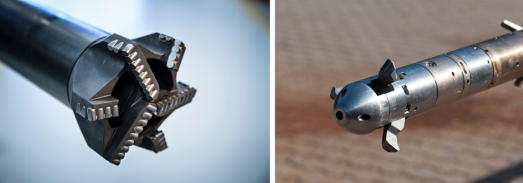 圖5左:磨銑器RCB(reverse circulating bit)反循環(huán)鉆頭是一項(xiàng)最近推出的塞銑工具,是Welltec公司為磨銑過(guò)早形成裂縫堵塞和清除長(zhǎng)水平段水泥夾層而推向美國(guó)市場(chǎng)的一項(xiàng)服務(wù)。右圖:Welltec公司正考慮在鷹福特頁(yè)巖的機(jī)械隔離再壓裂市場(chǎng)部署2 3/8”機(jī)械銑刀,以替代化學(xué)分流器方法。該工具能以光滑的斜面整齊地切割4”套管,允許通過(guò)切口部署射孔槍和堵塞,同時(shí)限制對(duì)其后面的原始套管造成損壞。