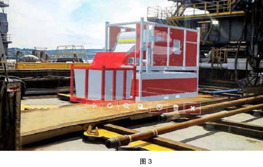 在過去的12個月里,該公司已對沉浸式AR/VR技術進行了測試,并商業(yè)化地將該技術運用到了美國和英國陸上鉆機和海上鉆井平臺的布局中。增強現(xiàn)實AR可實現(xiàn)更快的決策。在位于英國一個碼頭附近的兩部海上鉆井平臺上,沉浸式AR/VR解決方案得到了良好的運用,以評估一組鉆機固控設備和分離裝置安裝的可能性。演練對除氣器和振動篩區(qū)域、固井動力裝置、固井泵裝置、旋轉鉆臺、以及管子甲板進行了完整的掃描。AR/VR技術生成了一個鉆機現(xiàn)場的3D全息模型展示,捕獲了精準和詳細的測量值和準確無誤面積展示。見圖3,使用該系統(tǒng)的全息模型查看器,分離和復原裝置被虛擬地放置在了平臺上。