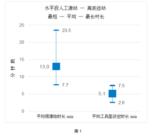 鉆頭離底的自動化主要指的是在滑動之前鉆頭提離井底后發(fā)生的所有的操作活動。例如,鉆頭離底后的其中一項(xiàng)關(guān)鍵操作就是將其下至井底執(zhí)行滑動。置鉆頭于井底的關(guān)鍵操作又包括多個子操作,例如,在鉆頭吃入地層前輸入反扭矩以及根據(jù)壓差檢測井底狀態(tài),這些都必須由控制系統(tǒng)來操控。離底作業(yè)的自動化對滑動鉆進(jìn)過程的整體優(yōu)化具有重要影響。在實(shí)施這項(xiàng)自動化技術(shù)之前和期間進(jìn)行的人工滑動分析表明,各個井、各個井段和不同定向司鉆之間在鉆頭離底的時長方面存在著很大差異。一項(xiàng)對水平段進(jìn)行的超過750次人工滑動的分析顯示,離底作業(yè)期間(預(yù)滑動或滑動準(zhǔn)備的時長)平均為13min,其中最短的為7.7min,最長的為23.5min,見圖1給出的水平段離底時長的分析。這一巨大的差異可以通過滑動自動化方法有效的予以解決,可為石油公司或運(yùn)營商節(jié)省大量的費(fèi)用。