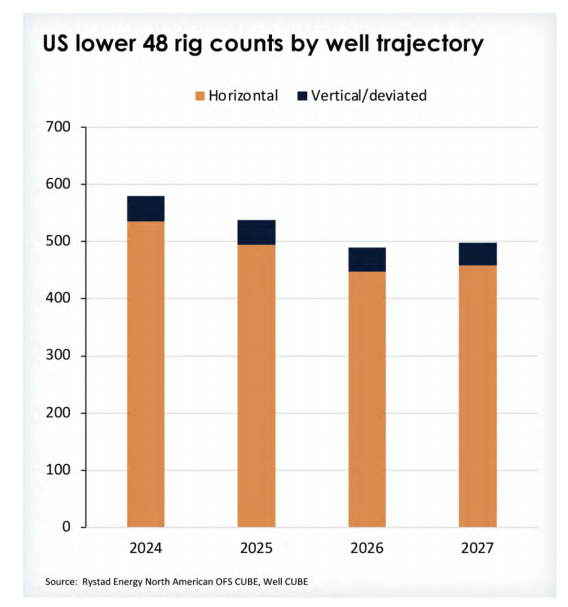 Rystad指出,2026年美國本土48州的鉆機數(shù)量或?qū)⒀永m(xù)下行趨勢。其中水平鉆機數(shù)量預(yù)計將從去年的494臺降至明年的448臺。不過隨著天然氣價格走高,天然氣富集盆地的鉆探活動將隨之增多,這一數(shù)值有望在2027年迎來回升,見圖1。