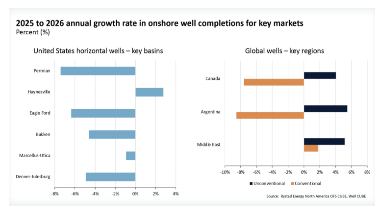 Rystad預(yù)測,鑒于油價持續(xù)徘徊在60美元區(qū)間低位,水平井年完鉆量增速或?qū)⒄w同比下滑。但如果亨利港天然氣價格能夠如該機構(gòu)所預(yù)測的那樣,從3美元/百萬英熱單位區(qū)間中段攀升至4美元/百萬英熱單位以上,那么天然氣富集的海恩斯維爾頁巖產(chǎn)區(qū)的油井完鉆量有望實現(xiàn)增長。右側(cè)圖表分析:從全球范圍來看,那些正積極推進基礎(chǔ)設(shè)施建設(shè)并著力挖掘液化天然氣出口潛力的地區(qū),包括加拿大、阿根廷以及中東地區(qū),其2026年的陸上油井完鉆量預(yù)計將實現(xiàn)同比增長,見圖2。