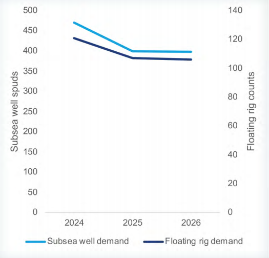 圖2 伍德麥肯茲預(yù)計(jì),2025至2026年浮式鉆井平臺(tái)市場(chǎng)不會(huì)出現(xiàn)顯著變化。2025年全球浮式鉆井平臺(tái)的市場(chǎng)平均需求量預(yù)計(jì)為107座,2026年則為106座。海底油氣井?dāng)?shù)量同樣將保持相對(duì)穩(wěn)定,2025年為400口,2026年為398口。