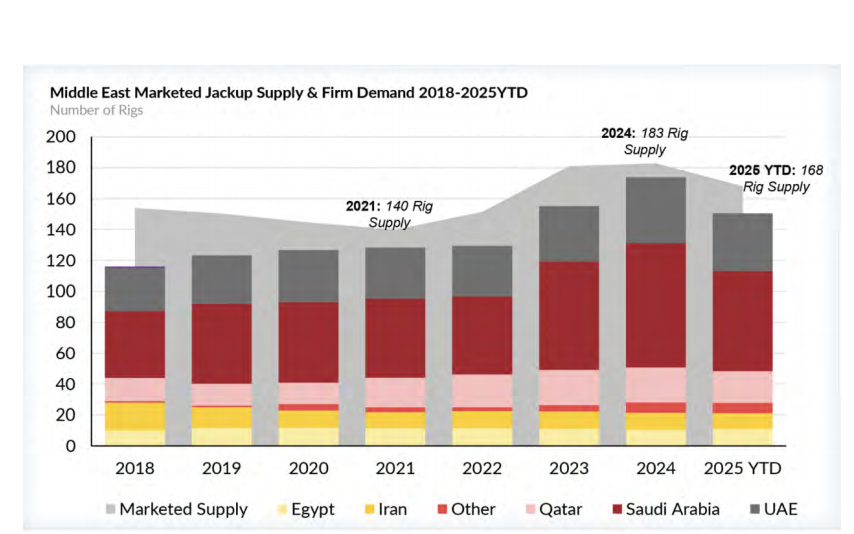 受沙特阿美2024年暫停自升式鉆井平臺(tái)合同的影響,中東地區(qū)海上鉆井平臺(tái)數(shù)量出現(xiàn)顯著下滑。2025年,該區(qū)域海上鉆井平臺(tái)的市場(chǎng)供應(yīng)規(guī)模降至168座,較2024年的183座有所減少,且這些平臺(tái)幾乎全部來(lái)自海灣合作委員會(huì)的六個(gè)成員國(guó)——巴林、科威特、阿曼、卡塔爾、沙特阿拉伯及阿聯(lián)酋。