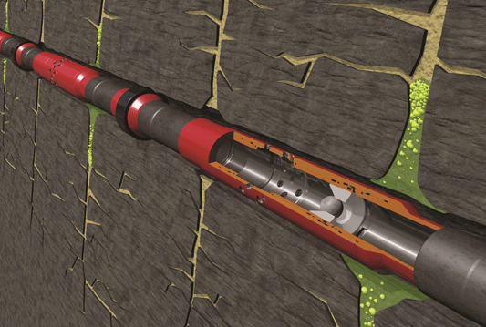 光纖輔助的連續(xù)油管(CT) 多 分 支 工具(MLT) 的 研發(fā)是為了實(shí)施各分支進(jìn)入和酸處理方案。在詳細(xì)介紹了首個(gè)全球范圍的應(yīng)用之后,這項(xiàng)技術(shù)的使用變得越來(lái)越普遍。MLT 基本上是一個(gè)流量激活的彎短節(jié),彎短節(jié)伴隨著光纖連接的CT(e-coil 帶 電 連 續(xù) 油 管) 下入井內(nèi)。利用液壓趨勢(shì),對(duì) MLT與興趣窗口是否對(duì)準(zhǔn)進(jìn)行確認(rèn),確認(rèn)對(duì)準(zhǔn)后,利用套管接箍定位器(casing collar locator,簡(jiǎn)稱(chēng) CCL)的關(guān)聯(lián)性與伽馬射線標(biāo)識(shí)來(lái)確定分支身份。MLT 進(jìn)入各分支實(shí)現(xiàn)促產(chǎn)MLT 到達(dá)各水平分支的總井深是促產(chǎn)計(jì)劃的一項(xiàng)要求。